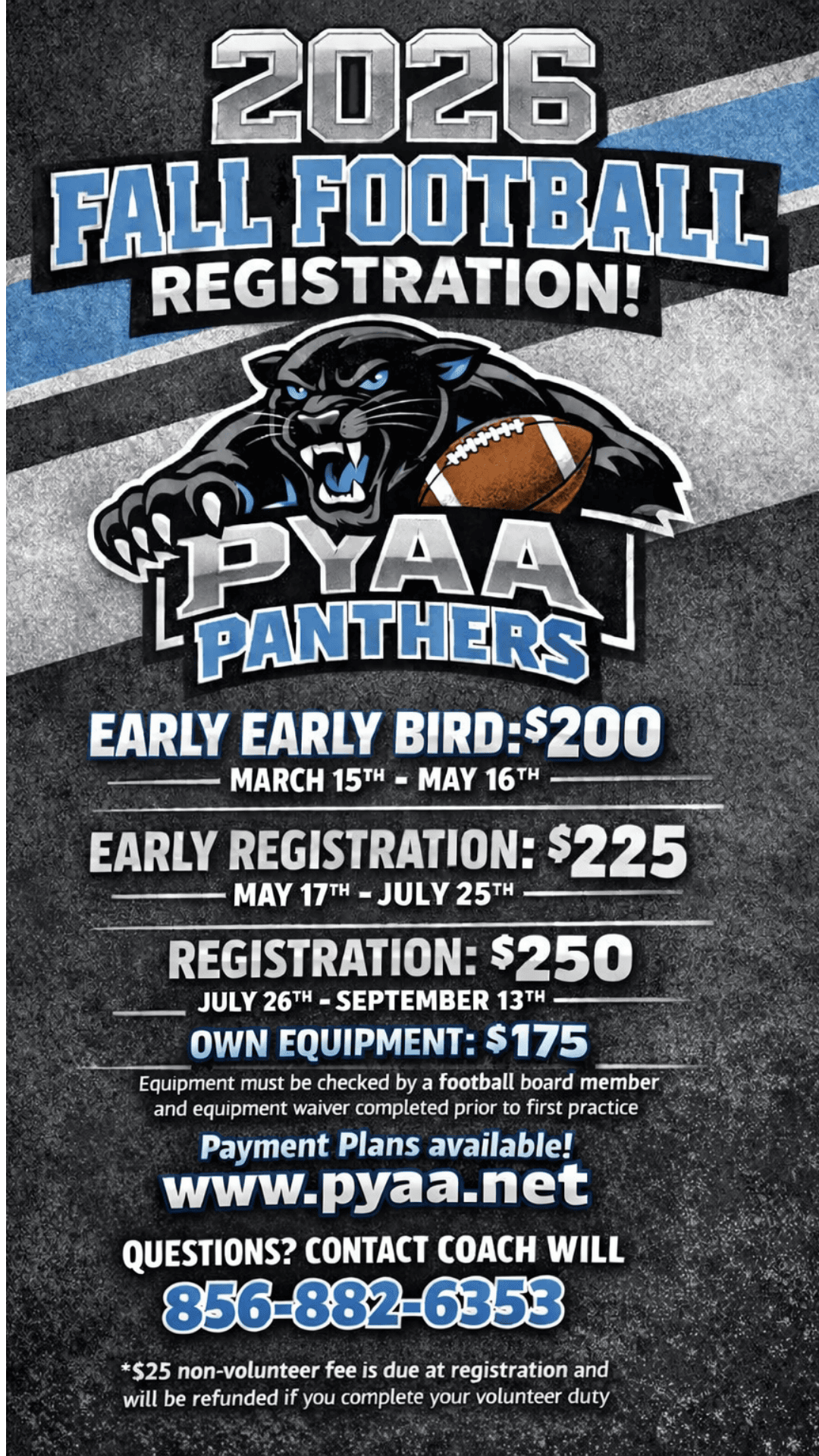 THE LAST DAY TO REGISTER FOR SPRING TACKLE, 8U FLAG, AND 7V7 IS THURSDAY MARCH 19, 2026 BY 11:59PM.